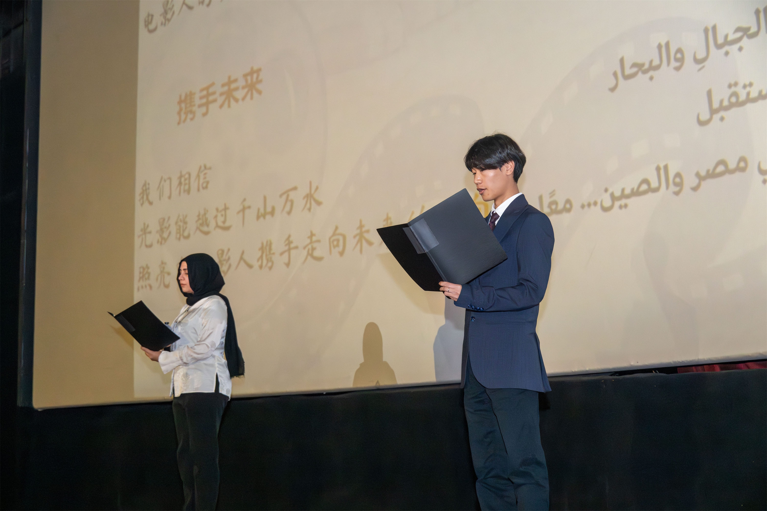 开幕式还上演了独具特色的文化交流环节。中埃青年影人共同登台,以中文与阿拉伯语朗诵“中埃光影之约”,赢得现场阵阵掌声。